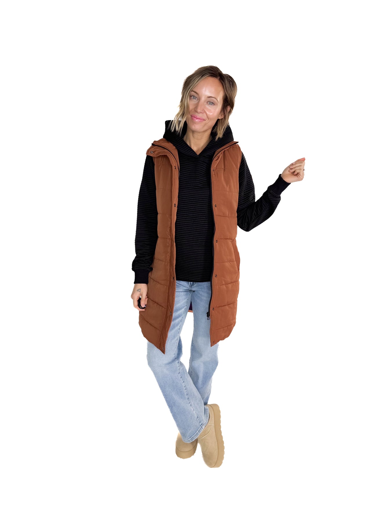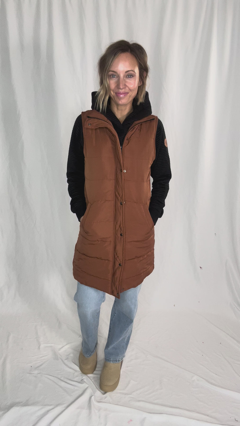 Layer up without the bulk—this longline padded vest features a cling-free liner for smooth comfort and sleek style on the go. 🖤🧥 #LayerGameStrong #VestGoals