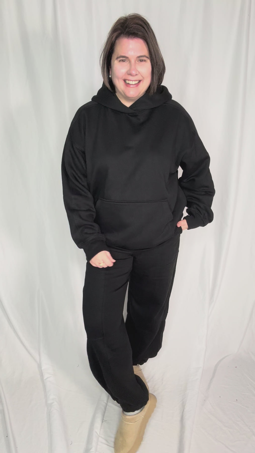 Additional: Elastic waistband with drawstring, relaxed jogger fit, front and back pockets, soft and warm fabric