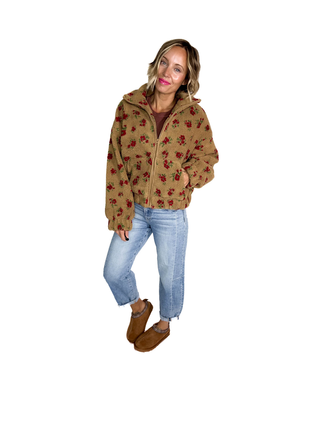 RD STYLE Morisa Mock Neck Zip Up Sherpa Jacket- TOFFEE-FINAL SALE