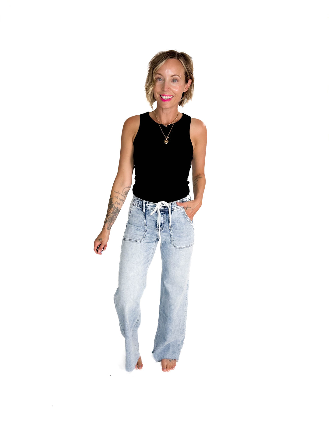 FLYING MONKEY Hazel High Rise Drawstring Wide Leg Jeans- LIGHT WASH