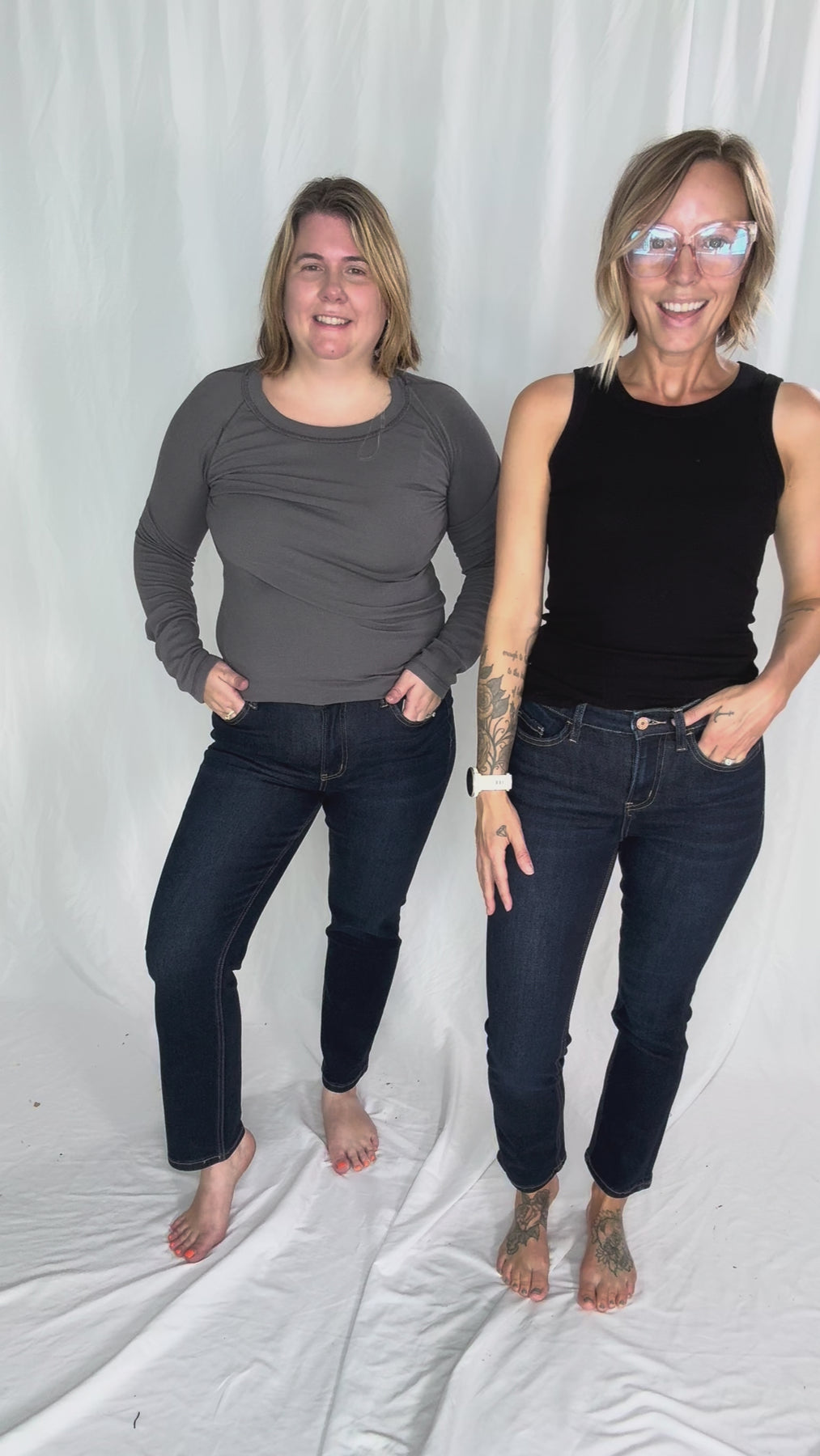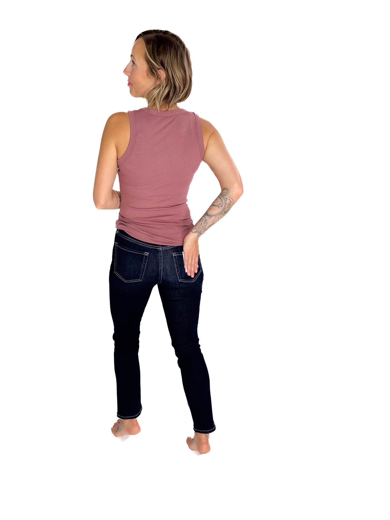 Everyday essential, elevated — dark wash slim straight ankle jeans with standout stitching.
