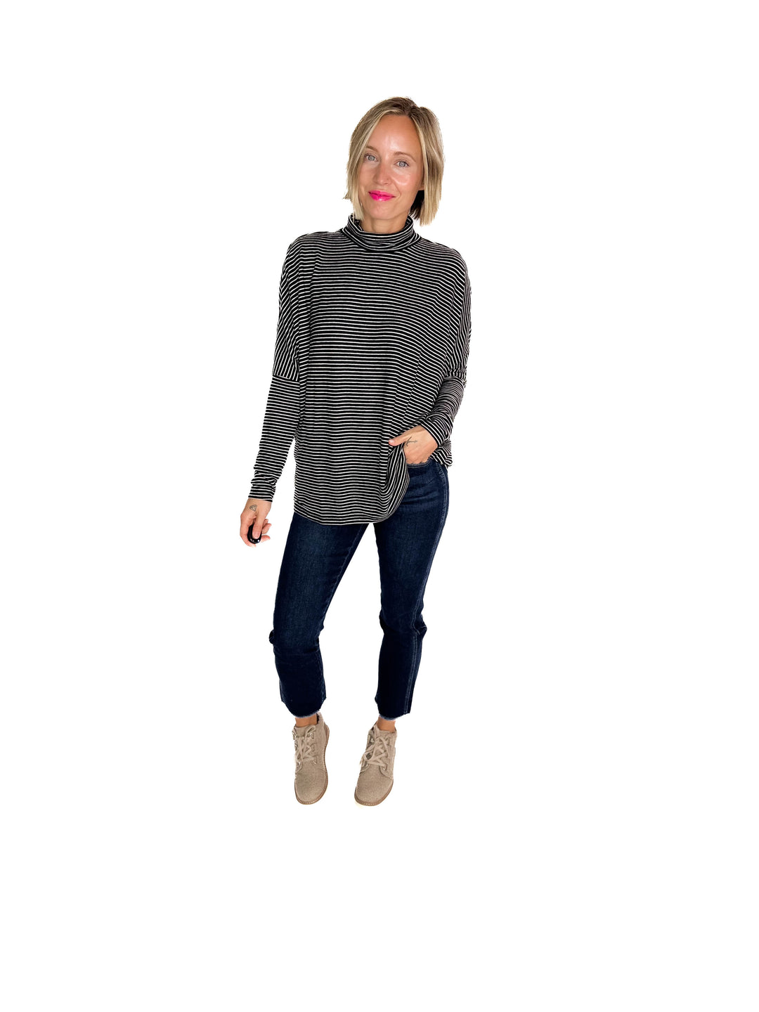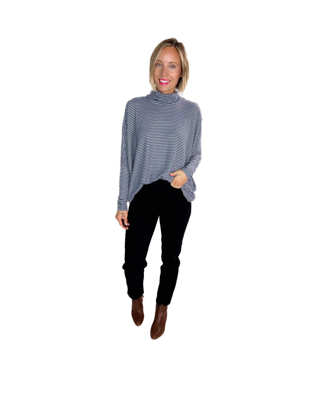 Mira Mock Neck Top- DUSTY NAVY/CREAM