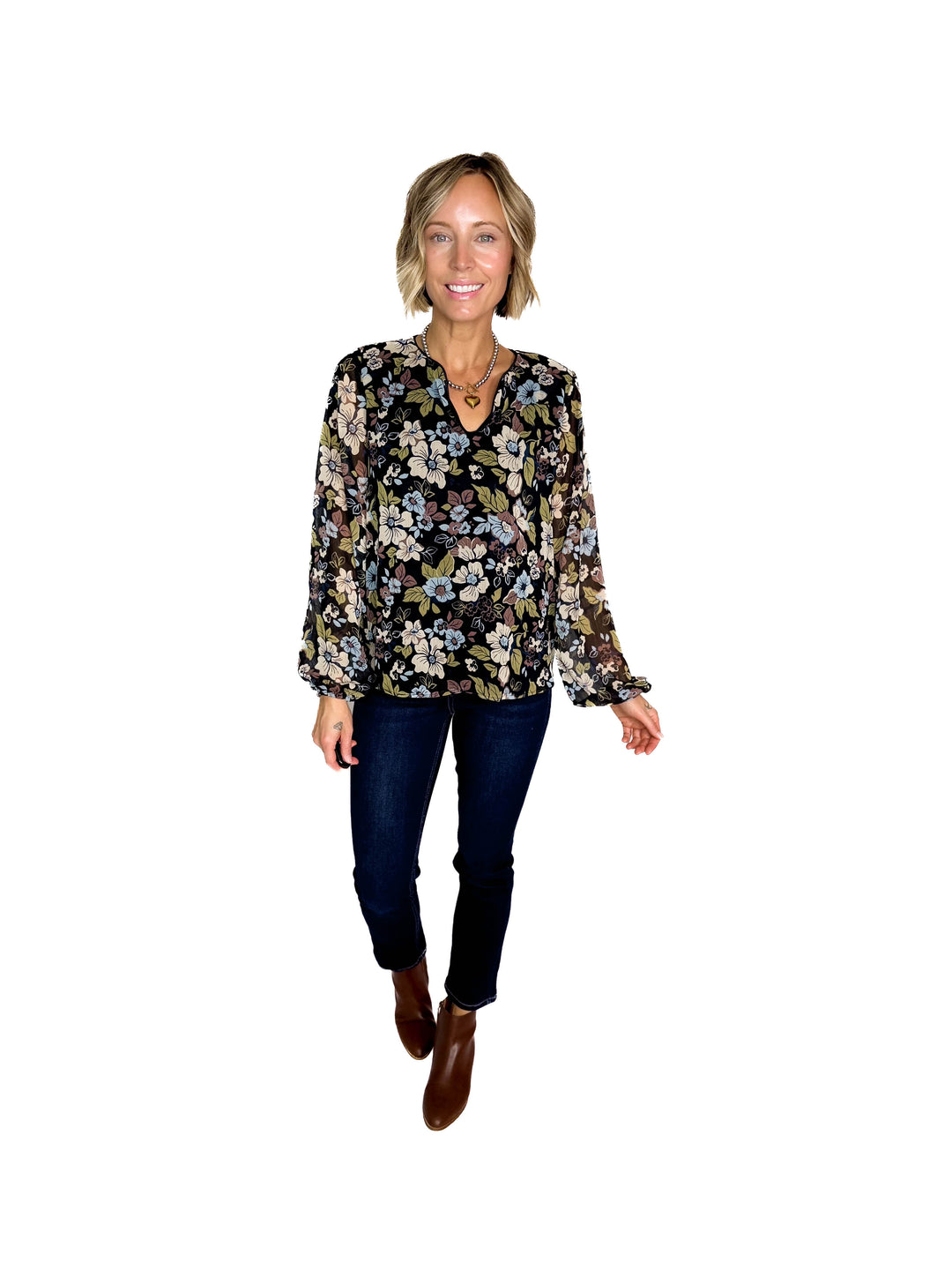 Elora Notch Neck Long Sleeve Floral Top- BLACK/MULTI FLORAL-FINAL SALE