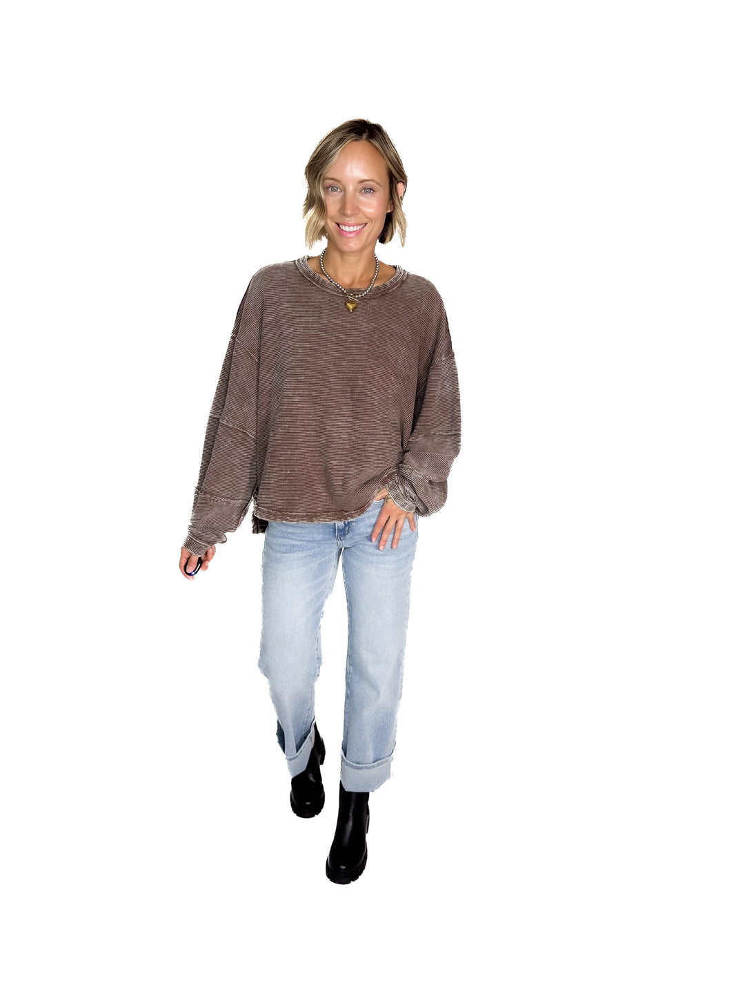 MONO B Aris Waffle Boat Neck Pullover- ESPRESSO