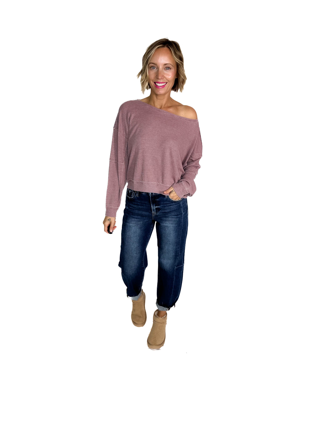 MONO B Aris Waffle Boat Neck Pullover- ROSE TAUPE