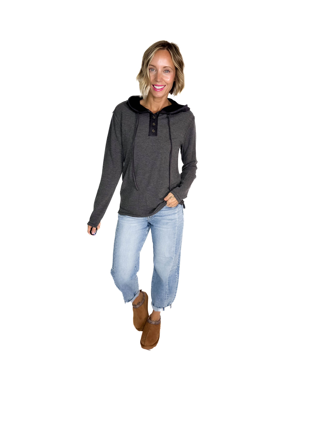 Gina Thermal Button Henley Hoodie- CHARCOAL