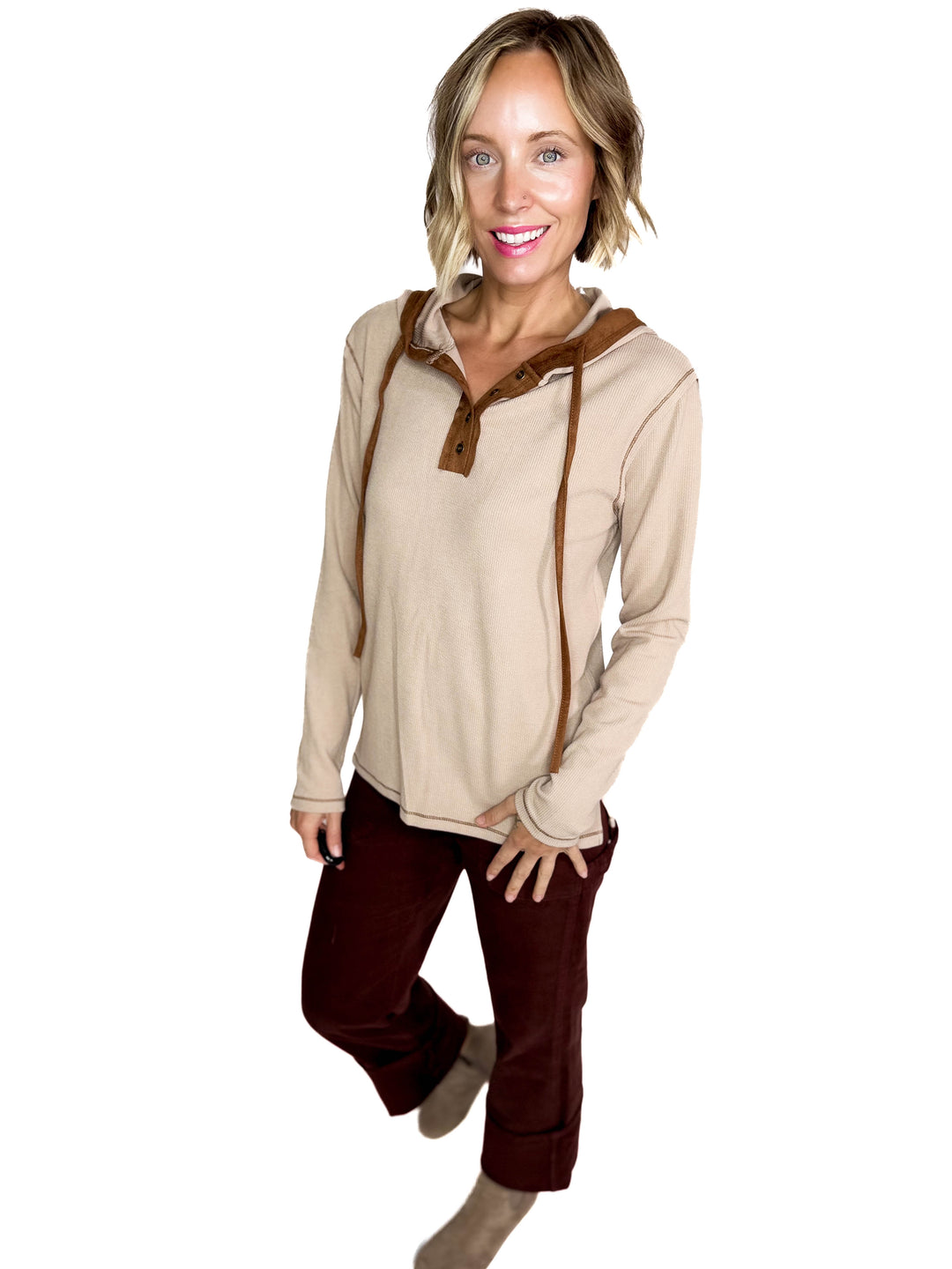 Gina Thermal Button Henley Hoodie- CAMEL