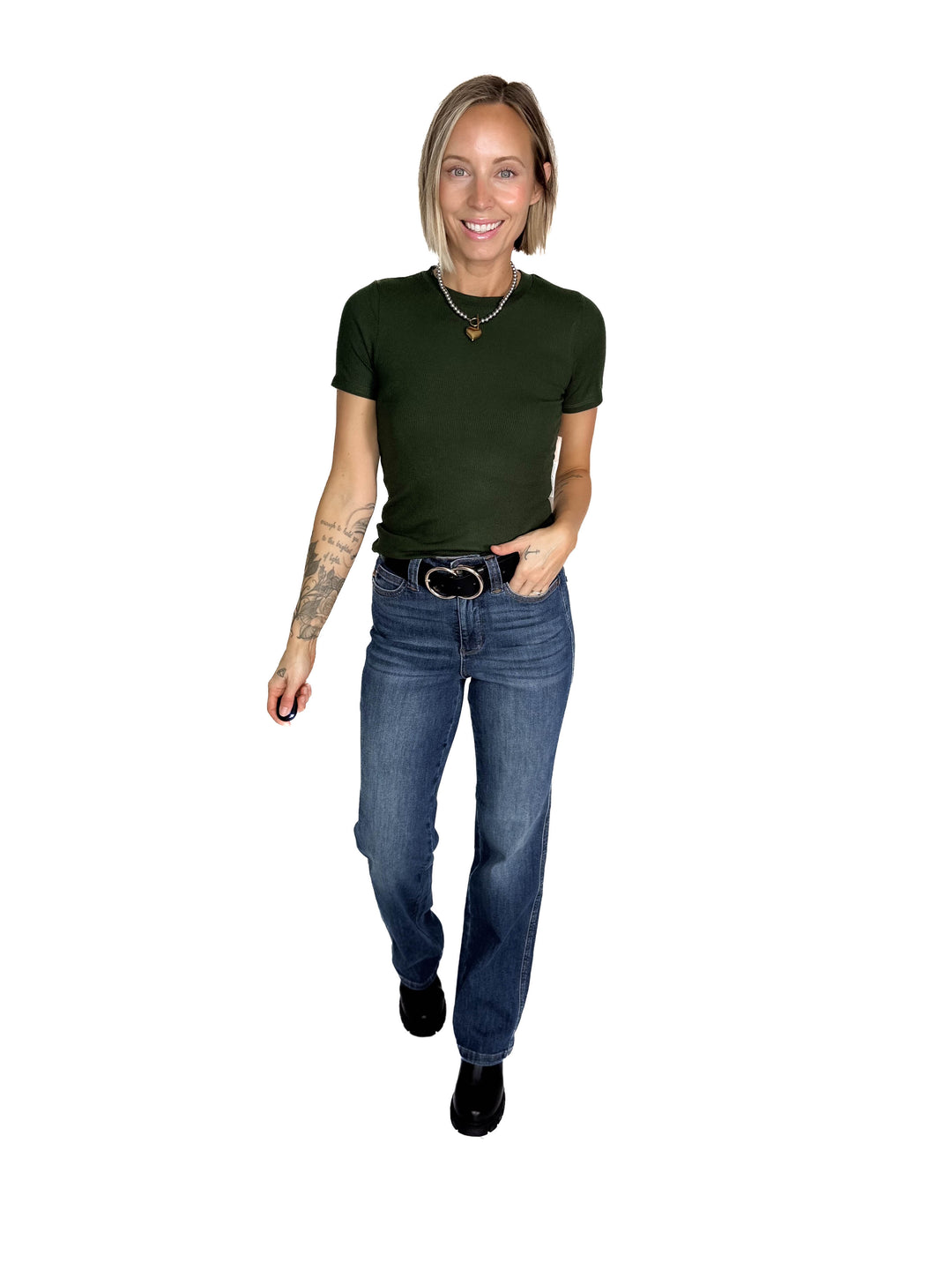Linley Short Sleeve Micro Ribbed Athleisure Top- DEEP FOREST
