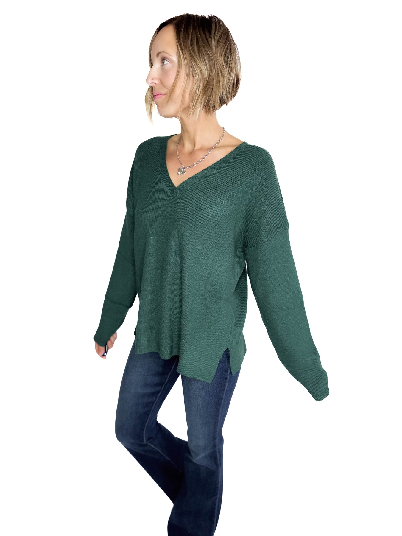 Jillian Knit V-Neck Drop Shoulder Sweater- TEAL GREEN